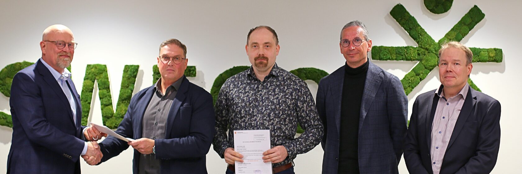 Pääesikunta luovutti Swecolle yritysturvallisuusselvitystodistuksen, jonka vastaanottivat Sweco Finland Oy:n toimitusjohtaja Thomas Hietto (kuvassa vasemmalla) ja Sweco PM Oy:n toimitusjohtaja Perttu Valtonen (kuvassa keskellä). Kuvassa oikealla Swecon turvallisuusjohtaja Cris Puchner ja laatujohtaja Rami Ylä-Pöntinen.