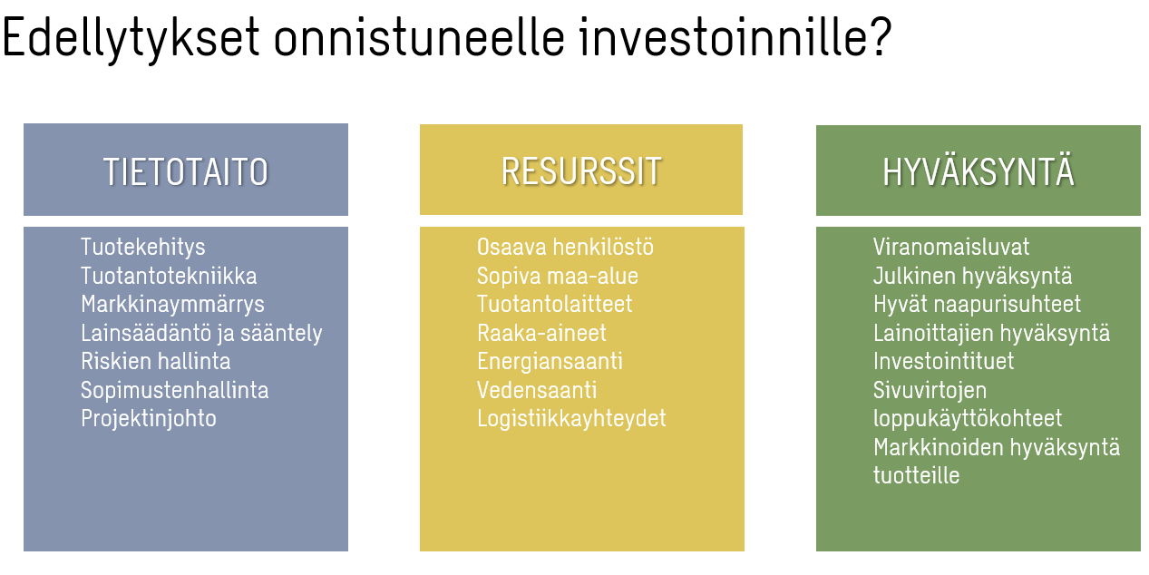 Riittävästi työvoimaa ja henkilöstöä, sopiva sijaintipaikka, oikeat koneet ja laitteet sekä raaka-aineiden, veden ja energian saatavuus.
