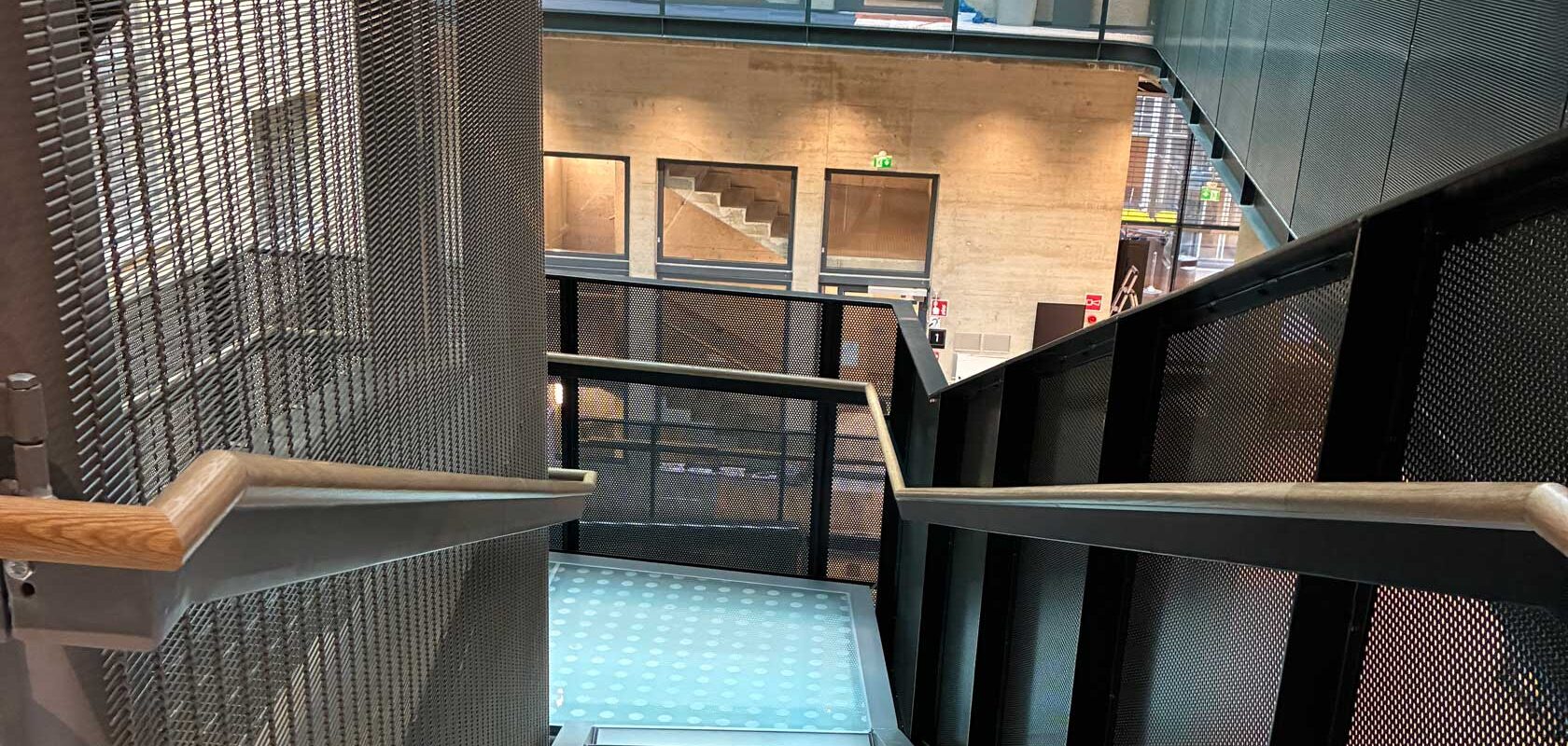 The steel-glass staircase now offers a new passage and at the same time a magnificent view through all five floors of Alexandria. The staircase also connects the future and history. The staircase is bordered on one side by the old plastered exterior wall of the Kaisa House, to which a new acoustic plaster was added during the renovations to improve the soundscape.